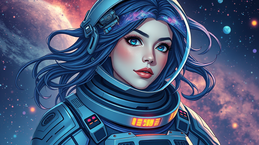 Woman in a space suit character portrait space art retro-futuristic armor highly detailed official artwork with hair resembling the Milky Way fantastic screenshot art hyperrealism dynamic lighting 3D cartoon anime sketches vivid colors ethereal atmosphere blending cosmic elements captivating galactic backdrop high-resolution quality.