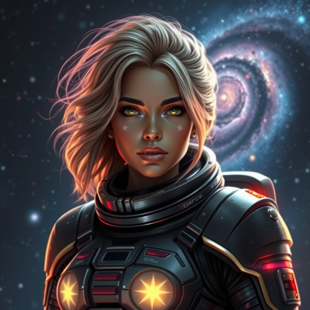 woman in a space suit character portrait space art retro-futuristic armor high detailed official artwork her hair resembles the swirling galaxies of the milky way fantastic screenshot art hyperrealism dynamic cosmic lighting blending with the deep void intricate star patterns illuminating her armor, creating a celestial aura around her figure