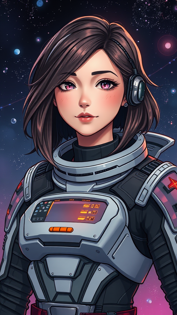 woman in a space suit character portrait space art retro-futuristic armor high detailed official artwork hair resembling the milky way fantastic screenshot art hyperrealism dynamic lighting 3d cartoon anime sketches vibrant colors enhanced contrast low resolution normal quality imaginative background celestial elements nuanced facial expression timeless elegance atmospheric ambiance