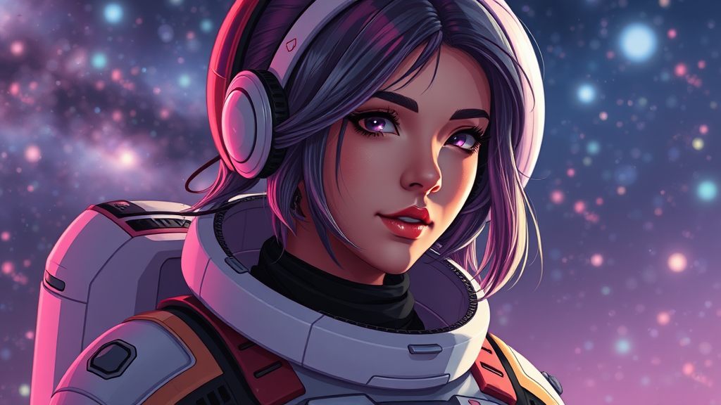 Woman in a space suit character portrait space art retro-futuristic armor high detailed official artwork her hair resembles the milky way fantastic screenshot art hyperrealism dynamic lighting 3D cartoon anime sketches vibrant colors sci-fi setting cosmic elements interstellar background ethereal glow refined textures expressive expression cinematic pose celestial ambiance