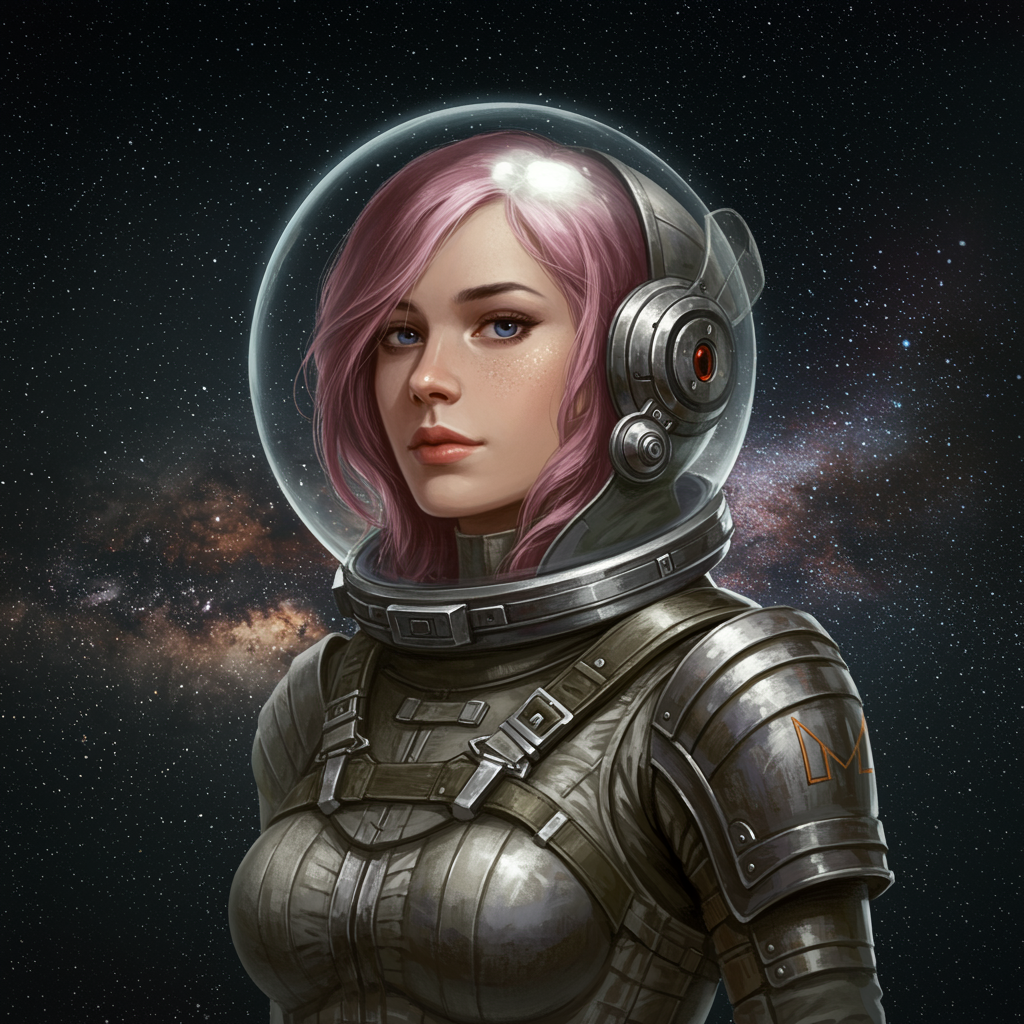Woman in a space suit, character portrait, space art, retro-futuristic armor, high detailed official artwork, her hair flows like the Milky Way, fantastic screenshot art, hyperrealism, dynamic lighting. Emphasizing elegance with a focus on cosmic beauty and mystery, this piece captures the essence of space exploration with a touch of retro-futurism. The detailed design of the space suit highlights sophisticated technology while remaining visually appealing. Avoid unnecessary elements that detract from the central theme, focusing instead on seamless integration of space and character elements.