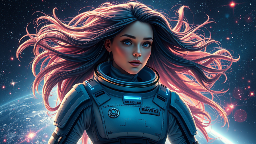 Woman in a space suit, illustrator's concept art, cosmic armor, illuminated artwork, meticulous texture, intricate detail, where her flowing locks resemble a swirling galaxy with starry wisps and nebulas, dynamic 3D render, stylized digital painting, classic sci-fi aesthetic, high polygon count, detailed normal map, varied lighting setups, created with 3ds Max, Maya, Clarisse, or Blender, suited for a high-quality poster, cinematic promotion, or futuristic packaging art.