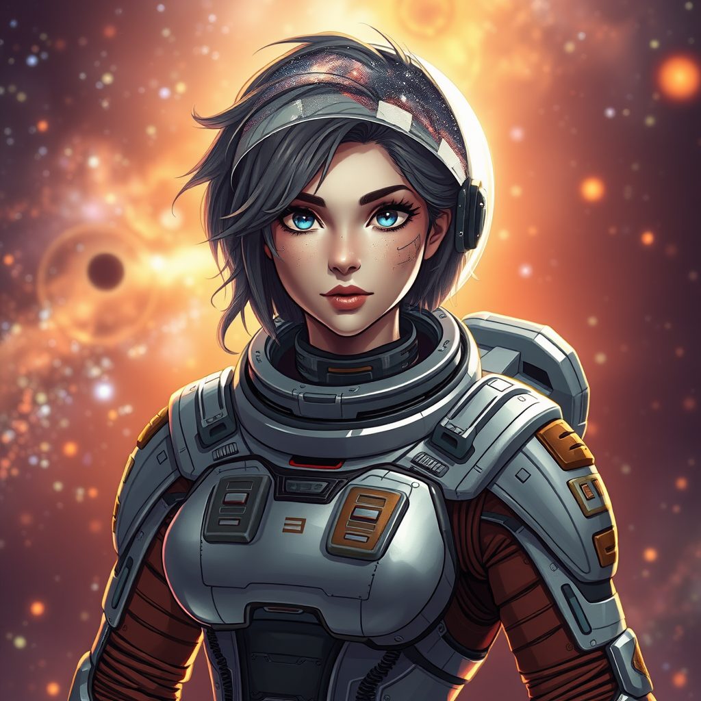 woman in an advanced space suit character portrait space art retro-futuristic armor highly detailed official artwork her hair resembling the milky way fantastic screenshot art hyperrealism dynamic lighting 3d cartoon anime sketches vibrant tones cosmic backdrop intricate textures celestial elements mysterious glow timeless elegance astronaut themes imaginative sci-fi atmosphere artistic fusion surreal space adventure