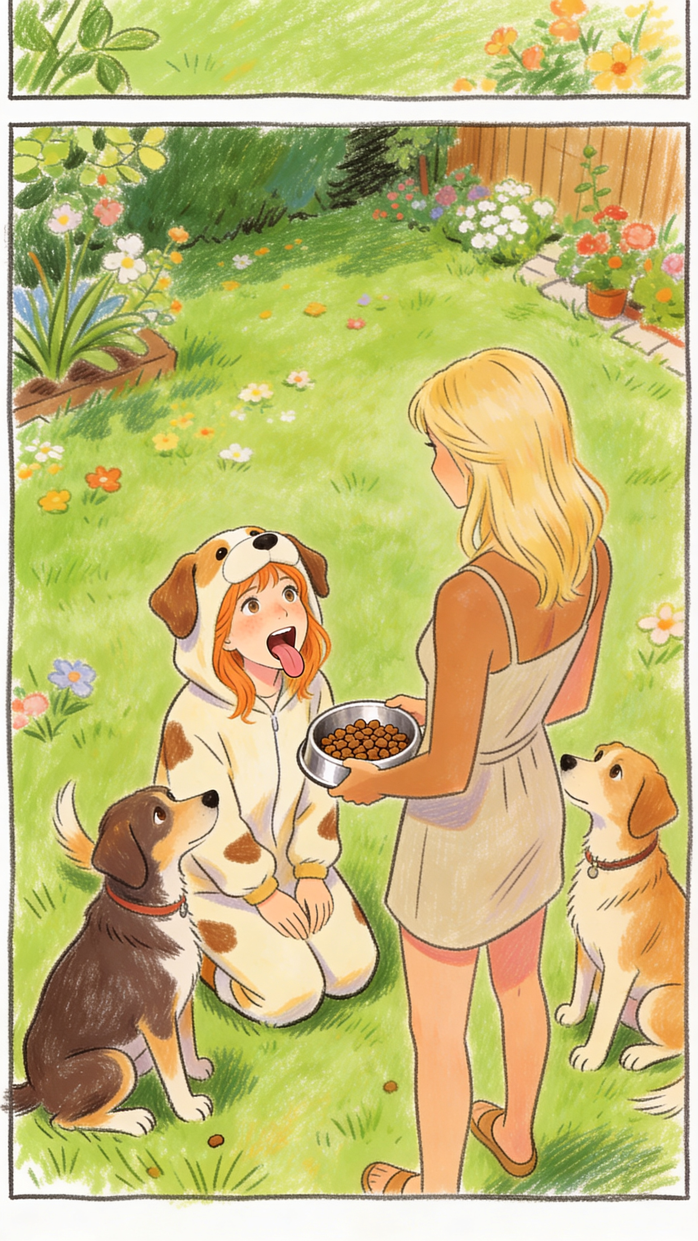 colour pencil sketch, comic book style, single white panel boarder., a light ginger woman wearing a dog onesie, she’s kneeling, her mouth is open and her tongue out, on both her sides are dogs sitting and obedient looking at the blonde woman., a tanned blonde woman wearing a casual summer dress, she’s standing infront of the light ginger woman and the dogs, she’s holding a food bowl filled with dogfood., garden