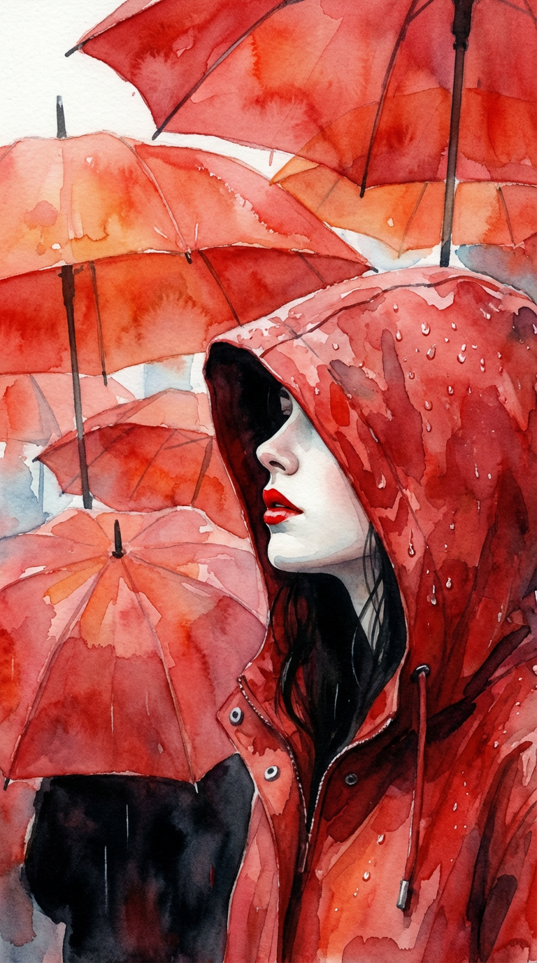 A striking watercolor portrait of a woman in profile, wearing a vibrant red hooded rain jacket with visible water droplets. Her pale face and bold red lips stand out against a background of abstract, overlapping red and orange umbrellas, creating a contemplative and melancholic mood.