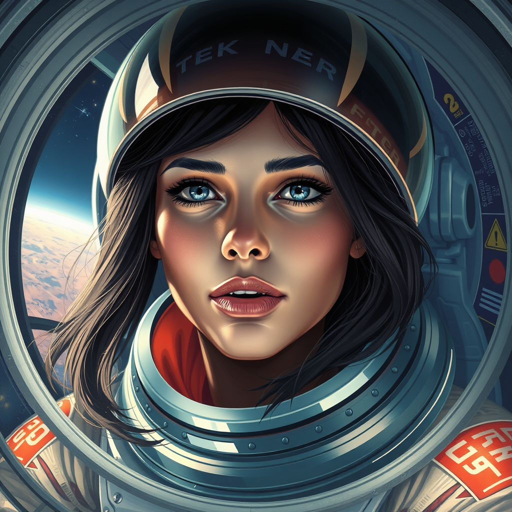 Woman in space art character portrait, high detailed official artwork, fantastic illustration, hyperrealism, dynamic lighting, realistic depiction, captivating atmosphere, heightened focus on detail, seamless composition, stunning colors, intriguing expressions, masterful technique.