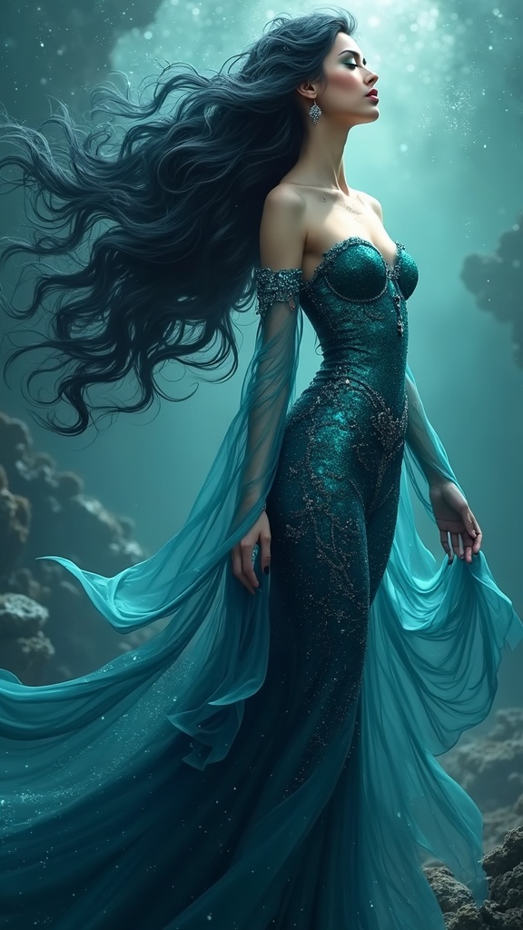 View this AI-generated image featuring a stunning and elegant woman inspired by ursula from disney portrayed as a mesmerizing figure with an air of grace and mystery her attire a luxurious blend of deep ocean hues her expression both alluring and powerful capturing the essence of a sea enchantress b