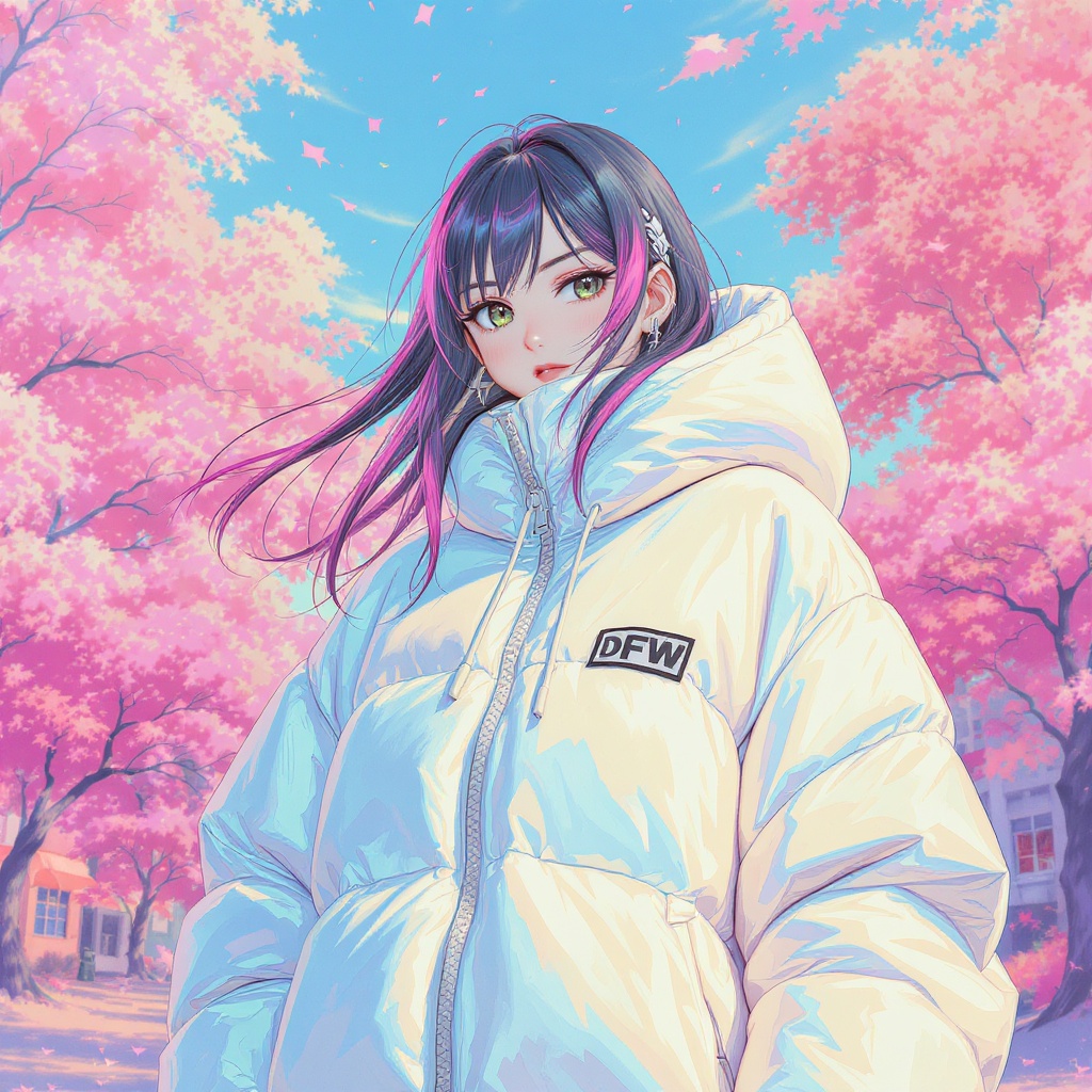 A 30-year-old woman, known as Dangerhorse, wearing a poncho-style oversized puffer jacket, inspired by OffWhite, combining influences from Tumblr and the unique style of Yanjun Cheng. The artwork is a digital masterpiece, reminiscent of the lofi girl internet meme, and is making waves on dezeen. Captured as a catalog photo, the scene is a 3D render by artists like Beeple, Rhads, and Lois van Baarle. It's a cartoon-style illustration bursting with bright pastel colors, showcasing a retro anime aesthetic. The composition is a strikingly beautiful artwork, slightly nostalgic yet refreshingly modern, capturing the fusion of diverse artistic styles.