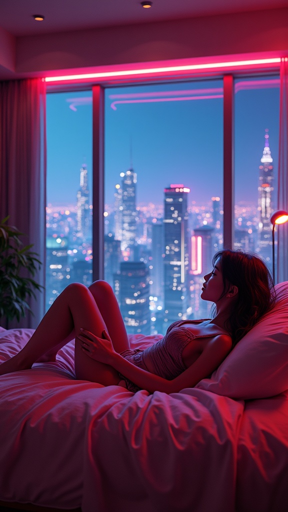 A young woman is lounging in a cyberpunk-themed bedroom, illuminated by the vibrant glow of neon lights. The room is sharply focused, showcasing a photorealistic setting rendered in Unreal Engine 5. She lies on the bed beside a large window that reveals a breathtaking view of distant skyscrapers bathed in the city's luminescent glow. The atmosphere is a blend of sci-fi and dystopian elements, with iridescent gold accents adding a touch of elegance. The cinematic lighting enhances the room's stunning detail, casting intriguing shadows and highlights that accentuate the cyberpunk aesthetic. Despite the high level of detail, avoid emphasis on unnecessary embellishments like poorly depicted anatomy or indistinct features, ensuring the scene remains coherent and captivating.