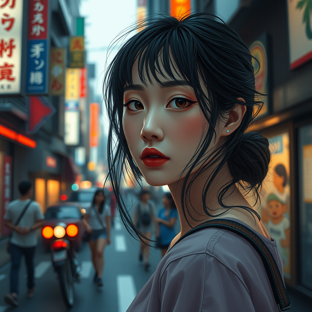 Woman portrait on bustling street of Tokyo, capturing the essence of Stefan Kostic, Andre Kertesz, and Masamune Shirow; rich illustration with an ArtStation and synth vibe; enveloped in moody lighting and atmosphere; shot with a telephoto lens for an intimate feel; the background fades into a gentle blur creating a tranquil and serene ambiance; subtle creative nuances reflect calmness and introspection.