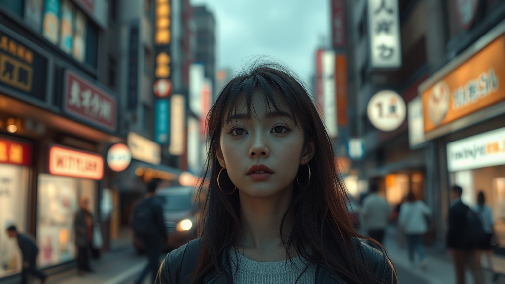Woman portrait on bustling street of Tokyo inspired by Stefan Kostic, Andre Kertesz, and Masamune Shirow, featuring illustration art with Artstation quality, synthetic ambiance, evocative lighting, serene yet moody atmosphere, captured with telephoto lens effect, a softly blurred urban backdrop, conveying tranquility and calmness, with gently muted hues.