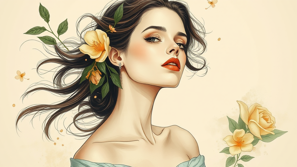 Woman portrayed through cinematic montage style, merging nature-inspired art nouveau elements, soft-focus aura enhancing her ethereal beauty, minimalist sketch approach with flowing curves and liberated brushwork. Elegance captured in elongated vertical form. Exquisite craftsmanship with a touch of modern stylization.