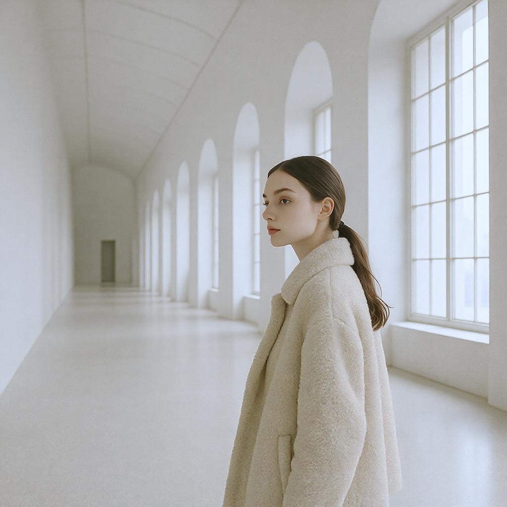 A young woman poses elegantly in a plush, textured jacket within a vast, minimalist museum hall painted in a pristine white. Positioned on the right of the frame, she gazes thoughtfully toward the tall, expansive windows that flood the space with natural light, casting a gentle glow around her. The scene captures a serene interplay of fashion and architectural simplicity, evoking a sense of modern sophistication and introspection.