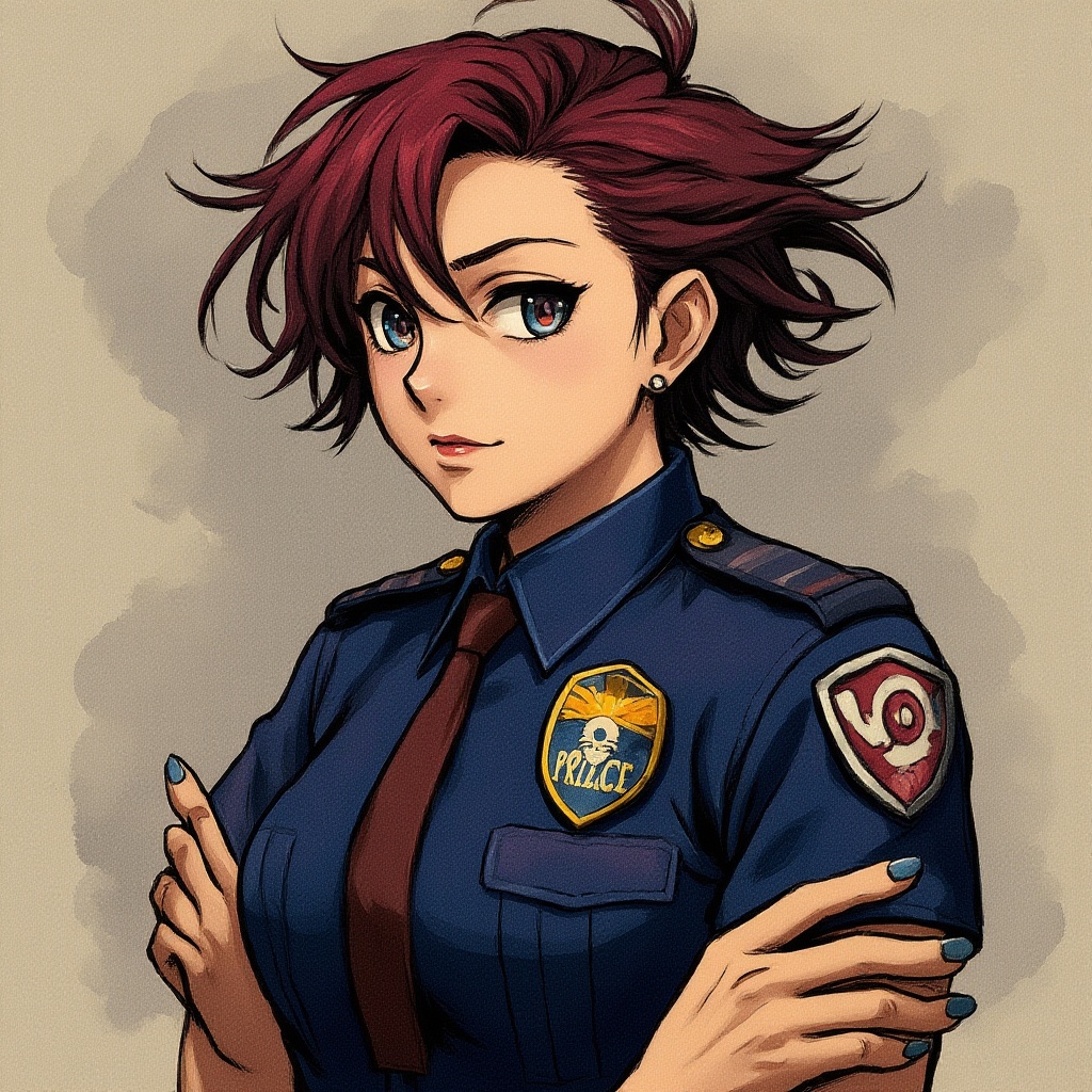 View this AI-generated image featuring a young woman reminiscent of jill valentine from resident evil 3 wearing a detailed police uniform with beautifully intricate colored hair an anime style portrait with strong hard shadows and vivid rim light created using watercolor with a traditional approach