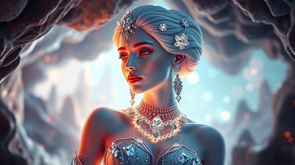 A stunning woman sculpted from diamond and silk, adorned with gems and sparkling dots, set against a crystal cave backdrop, in the style of Darek Zabrocki. The scene embraces magic realism with smooth gradient colors and cinematic lighting, featuring intricate bokeh effects. Rendered with Ultra-detailed Quality 3D, this creation merges the power of the Unreal engine and VFX techniques. The isometric perspective, crafted in Blender, brings out the luxurious 8k ultrahd clarity, perfect for wallpaper.
