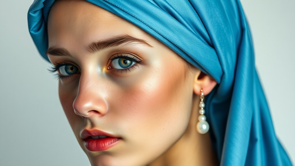 A young woman with a sky-blue silk headscarf that gracefully wraps around her head, accentuating her serene and enigmatic gaze. A single lustrous pearl drop earring dangles elegantly from her ear, catching the soft play of light. Her expression is one of quiet contemplation, and the soft folds of her headband provide a rich contrast to her luminous skin and the gentle shadows that play across her face. Her presence is timeless, a blend of mystery and classic beauty.