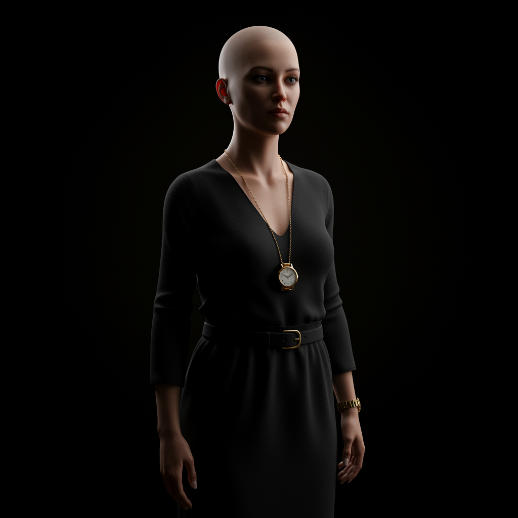 A bald woman standing in full height, adorned with a gold watch hanging around her neck against a rich black backdrop, rendered in 3D realism with cinematic lighting and high detail, evoking a dramatic, cinematic effect, aspect ratio 9:16.