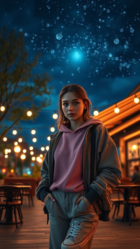 A young woman stands solo beneath a mesmerizing night sky, her silhouette illuminated by the soft glow of a detailed café setting. Her captivating eyes and perfectly shaped lips exude a sense of mystery, made even more enchanting by the professional lighting and cinematic atmosphere. She wears a pink sweatshirt paired with a stylish jacket, complemented by her white sneakers. This full-body shot captures her poised stance as she gazes directly at the viewer, embodying an effortless elegance. The scene uses advanced rendering techniques, such as photon mapping and radiosity, to create a highly realistic and immersive image. Emphasis is placed on the intricate details of her face and eyes while ensuring a harmonious balance with the environment. The outdoor ambiance is enhanced by the night’s serene beauty, lending an air of sophistication and grace to the overall composition.
