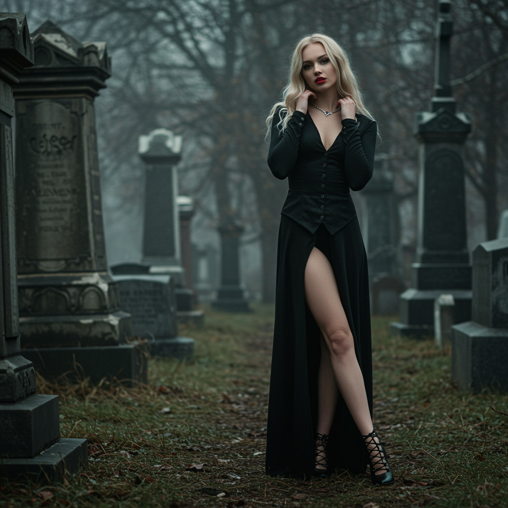 View this AI-generated image featuring a captivating woman stands gracefully in a cemetery exuding allure and a hint of flirtation as she gazes directly at the viewer the scene is captured in a stunning full length photograph with an emphasis on realism and detail showcasing a highly detailed depict
