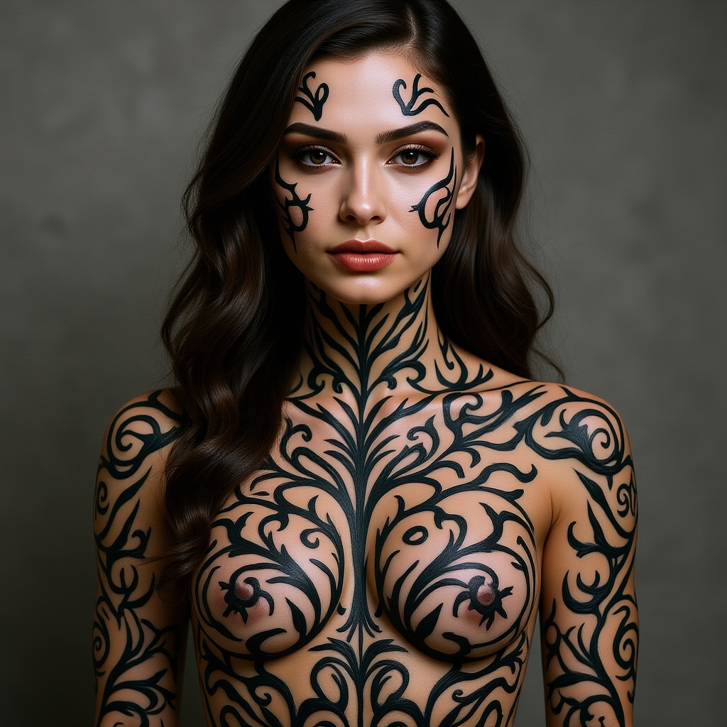 View this AI-generated image featuring a stunning woman with intricate tattoos black ink flowing artfully across her skin captured in exquisite detail and photorealism reminiscent of aaron horkey and jeremy mann this masterpiece is an 8k resolution intricately detailed fluid gouache painting evoking