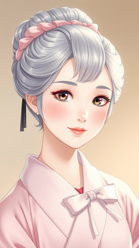Woman with silver hair in a luxurious updo, delicate features and porcelain-like complexion with a warm, honey-toned undertone, wearing a pastel pink haneka and ribbon bow, reminiscent of a Shinsengumi samurai guest visiting an esteemed onsen, complete with a faint blush and gentle smile, her deceptively innocent expression hiding a hint of slyness, short and stylish lavender locks framing her face, painted with subtle pastel colors evoking a childlike wonder, crafted in a realistic anime art style, highlighting the intricate details of her intricate black kanzashi and exquisite clothes, style inspired by the legendary Wang Wu, reminiscent of a cherished and delicate porcelain figurine, roots inspired by Crazy Monday's character designs, eyes painted with a soft gaze and hope, facial expression derived from Asparas' soft femininity, mixed and combined disparate pieces to create something unique and visually striking.