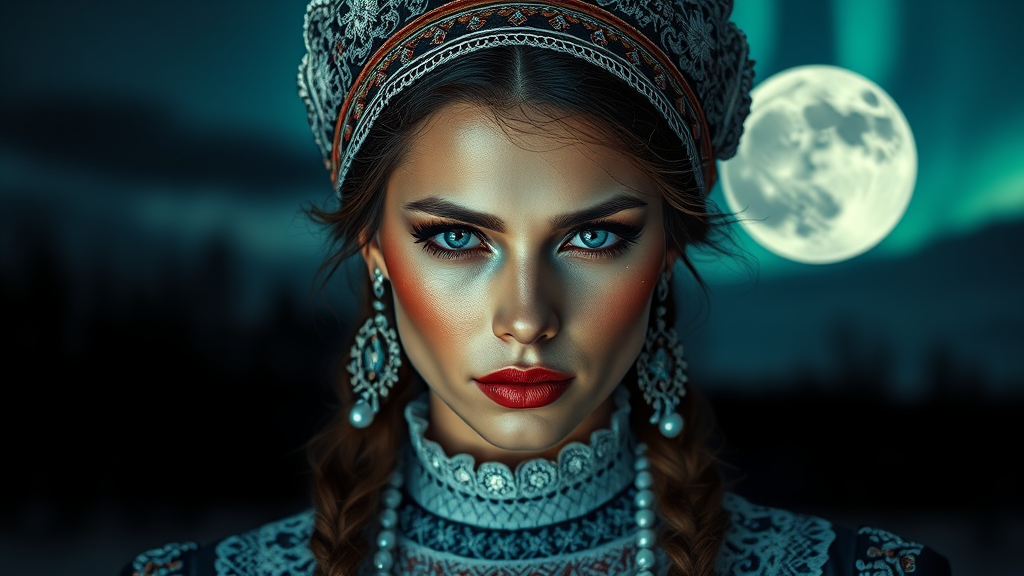 Woman with striking makeup and delicate filigree in her hair, wearing intricately embroidered bogdananka headdress and layering lace and linen intricately patterned folk costume, bright stars painted on her eyes, direct and piercing gaze locked intensely on the viewer, radiating an air of quiet confidence and undisputed authority, set against a dramatic backdrop of splintered moon and wispy, faded aurora borealis.