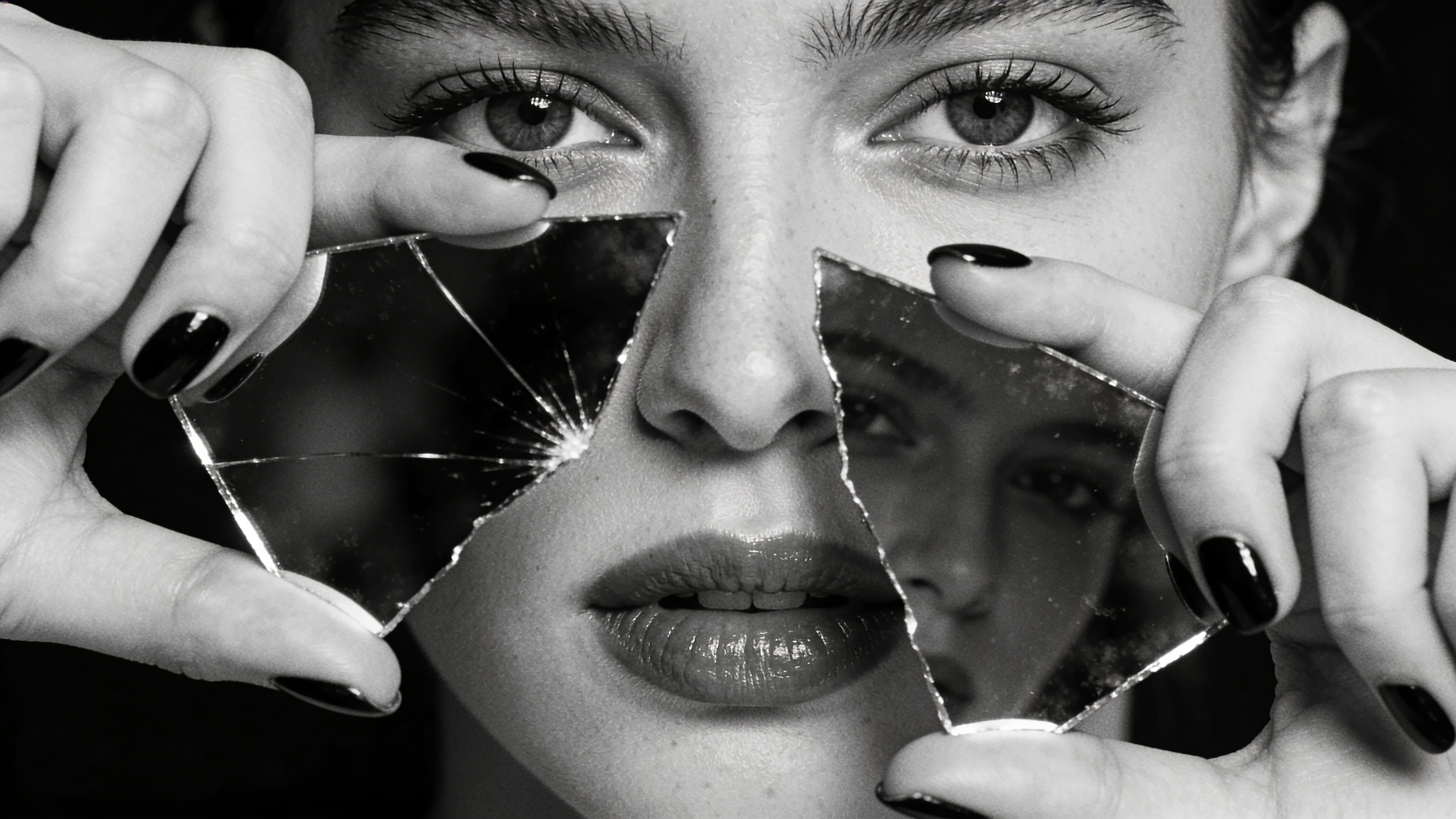 A striking close-up of a woman's face, with her reflection visible in pieces of a broken mirror she holds. Her dark fingernail polish adds a touch of drama to this almost monochrome, intense portrait.