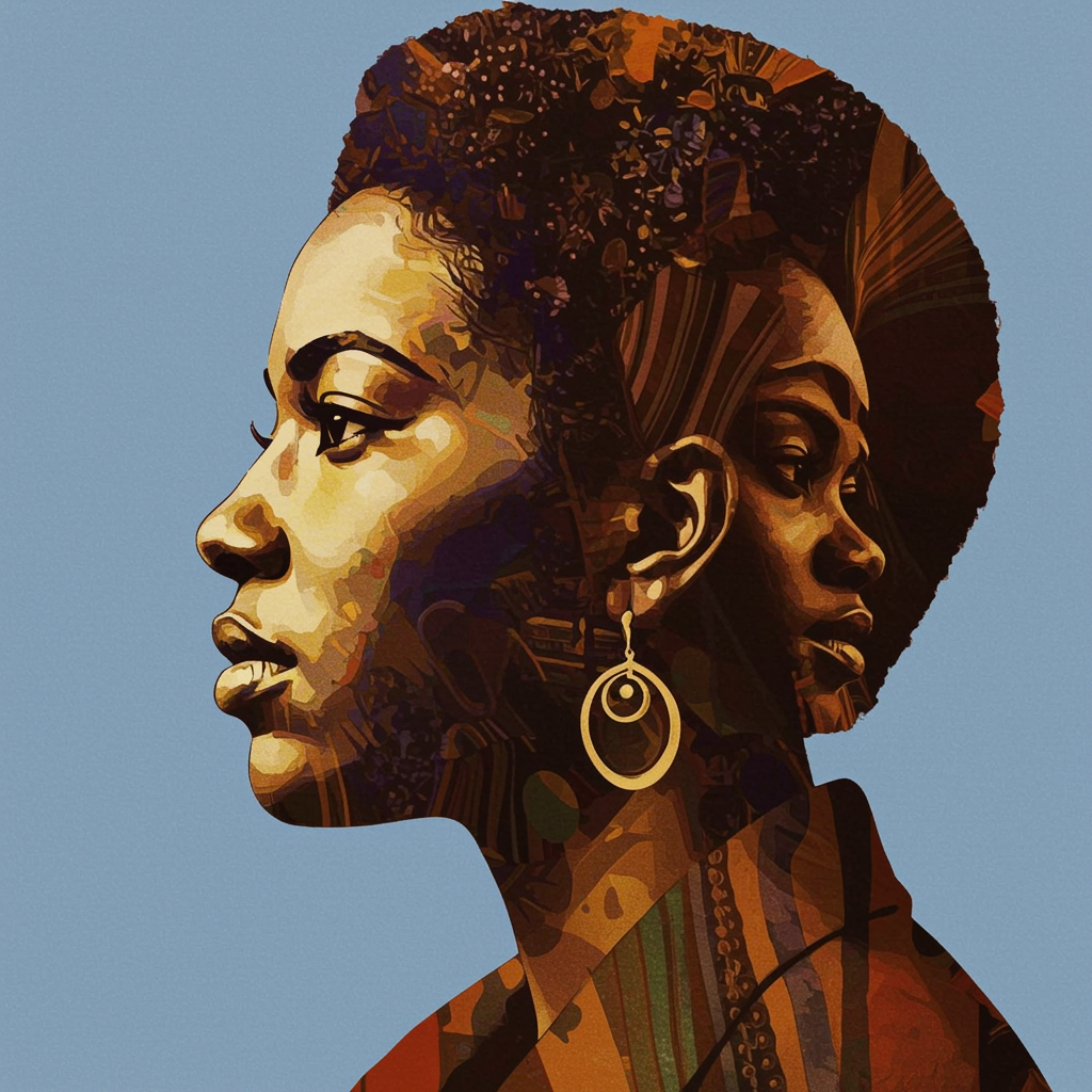 Woman's profile depicted in the style of timeless civil rights imagery, infused with shades of light indigo and dark amber, featuring abstract and colorful interpretations of faces. Inspired by iconic album cover art, with elements reminiscent of chiaroscuro woodcuts and split toning. Paying homage to Aaron Douglas, the composition blends bold visual elements with a high degree of stylization, capturing both historical resonance and artistic innovation. Aspect ratio 9:14, crafted with a harmonious blend of classic and modern artistic influences.