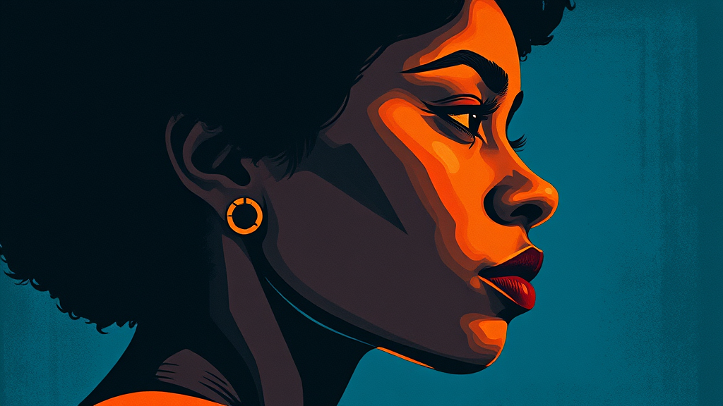 Woman's profile, reminiscent of iconic civil rights imagery, rendered in light indigo and dark amber tones; features abstracted and colorful faces, invoking the essence of iconic album cover art; incorporates chiaroscuro woodcut influences; split toning technique applied; inspired by the artistic style of Aaron Douglas, maintaining a 9:14 aspect ratio with an enhanced stylization level.