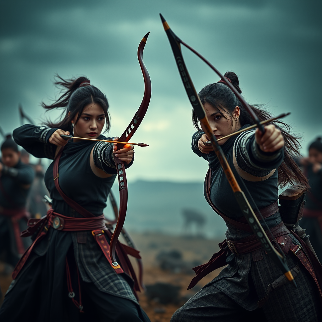Women archers in dynamic poses, wielding intricately designed bows, set against a backdrop of historical reimagining. The scene captures a cinematic montage filled with dark, explosive energy, featuring action-packed sequences in ultra-high definition, with a focus on vivid detail. They are garbed in traincore-inspired attire, moving with precision and power in intense action scenes, set in elongated, sweeping landscapes that accentuate their prowess.