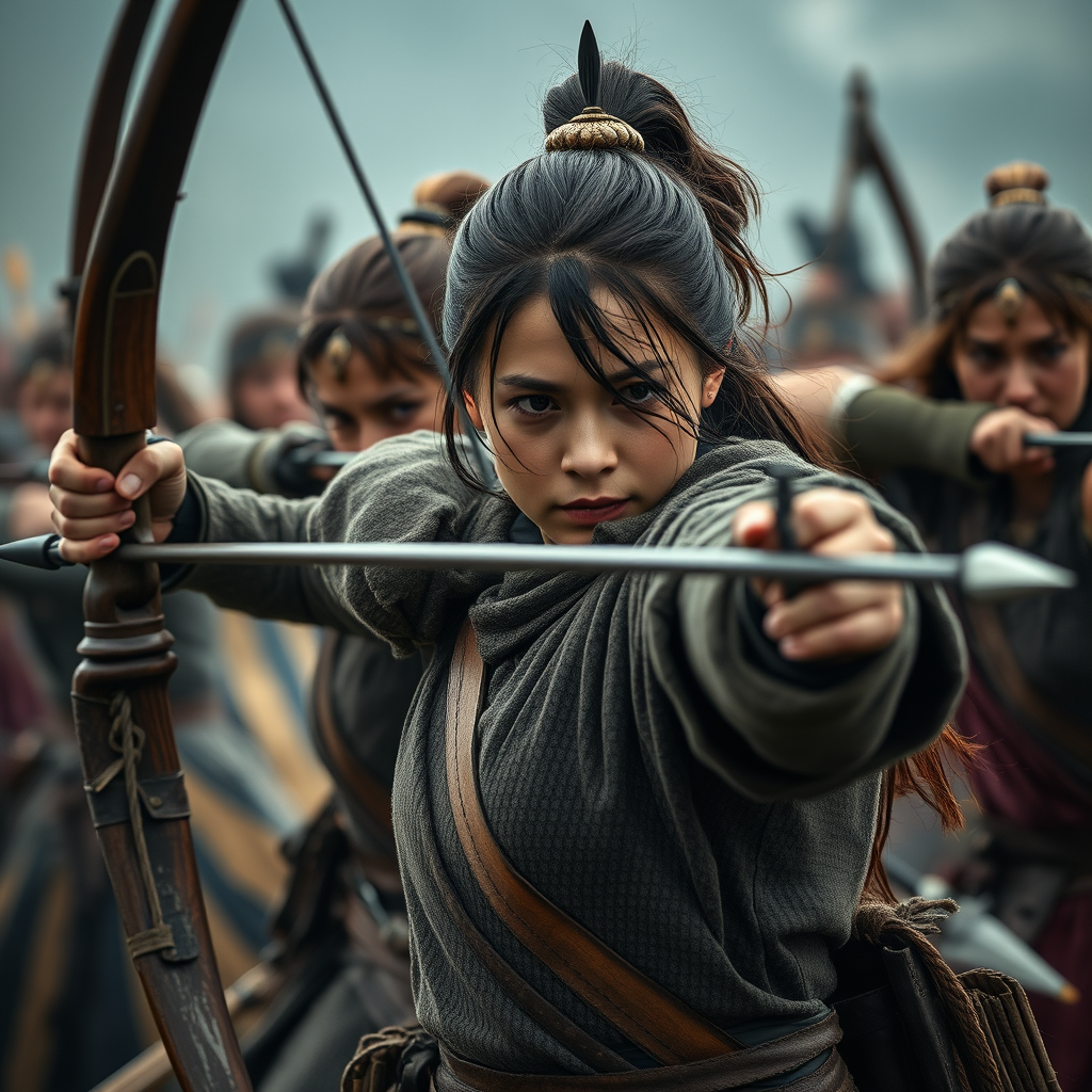 women archers wielding bows, envisioned through a historical reimagining lens, cinematic montages capturing dark and explosive moments, ultra-detailed in 32k uhd, featuring action-packed scenes, traincore elements, showcasing intense action sequences, dramatic and atmospheric, dynamic energy, vivid storytelling, intricate costumes, set in atmospheric landscapes, focused expressions and powerful stances, arrows in motion, epic and immersive visuals, mood-filled backgrounds.