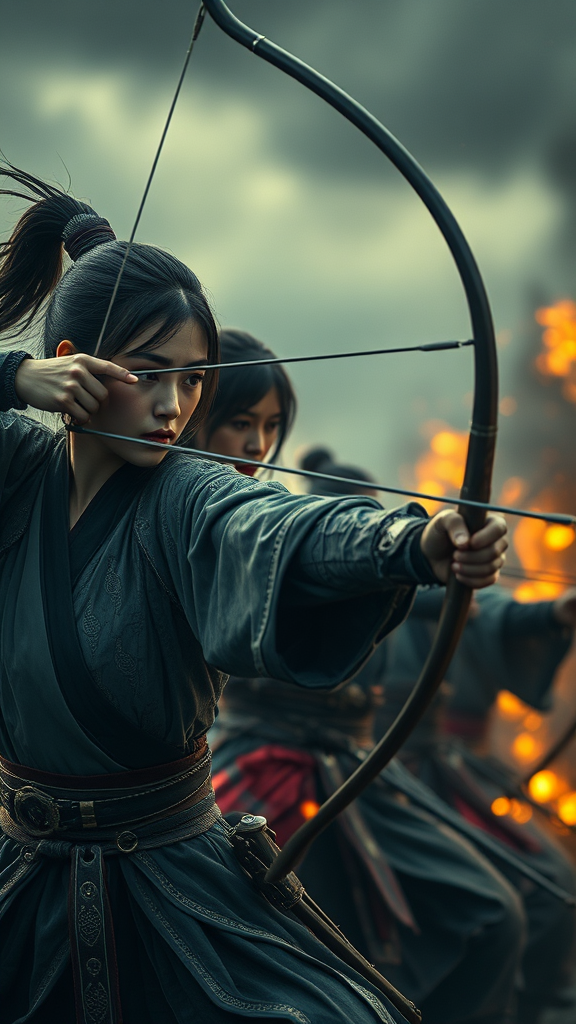 Women archers wielding bows in a historical reimagining, captured in cinematic montages, embodying a dark and explosive atmosphere in 32k ultra-high-definition. Intense, action-packed scenes featuring elements of traincore, showcasing fierce battles set against dynamic backgrounds. The imagery focuses on the raw power and precision of the archers, infused with a stylized blend of historical and contemporary elements, creating an immersive experience that highlights the strength and elegance of the warriors in motion.