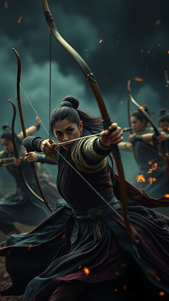 Women archers wielding intricate bows amid a historical reimagining, captured in cinematic montages with dark and explosive visuals, rendered in stunning 32k uhd. They navigate action-packed sequences, blending traincore elements with intense, fast-paced scenes, evoking a sense of dynamic energy. Despite the gritty atmosphere, an underlying elegance pervades their movements, artfully balancing chaos and control.