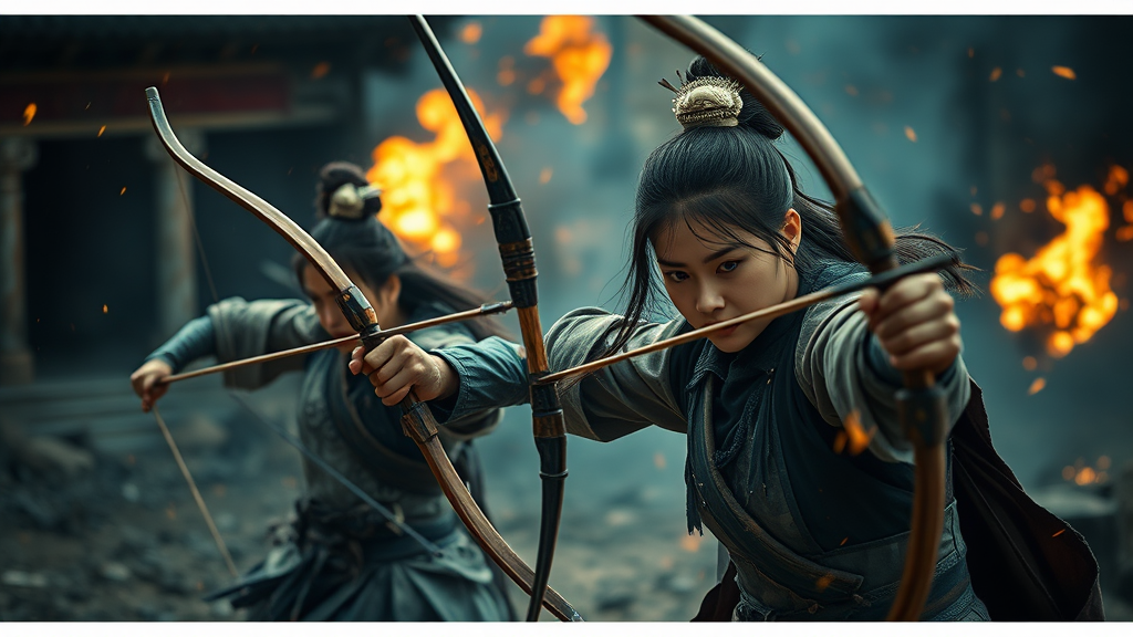 Women archers wielding intricate bows, set in a historical reimagining, depicting dramatic cinematic montages filled with dark, explosive elements. The scenes are rich in 32k ultra-high definition, brimming with action-packed sequences, and crafted with a traincore aesthetic. These intense scenes capture the essence of power and precision, showcasing the archers in dynamic environments, emphasizing their skill and strength amidst gripping action scenarios.