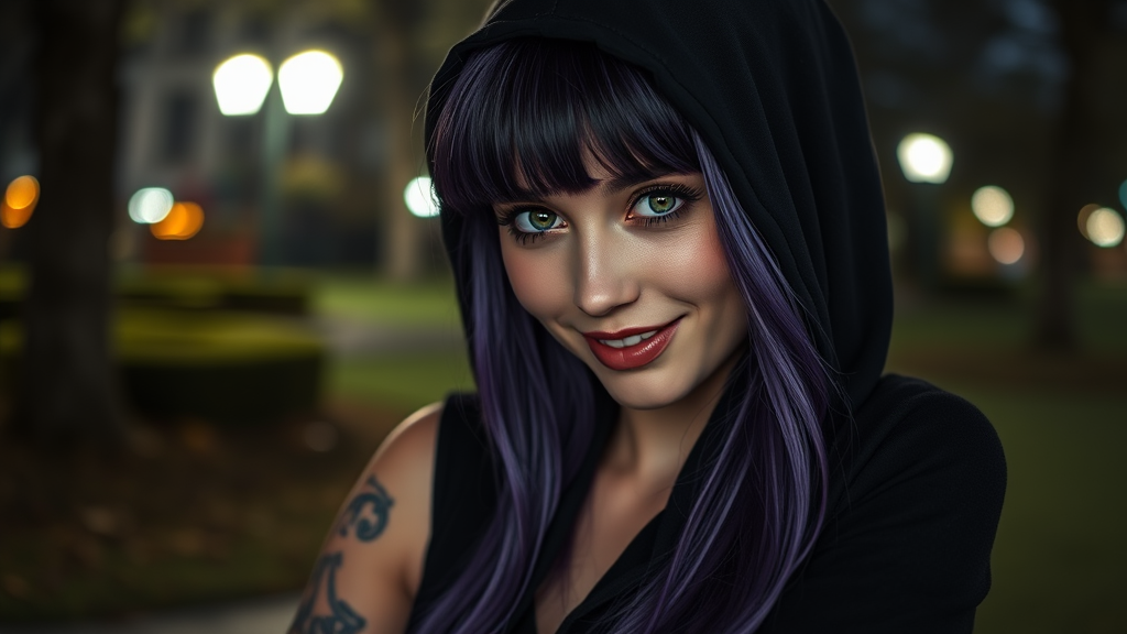 Women, black hoodie, sfw, arm tattoo, long hair, bangs, petite figure, striking green eyes, purple hair, detailed background, park setting, portrait style, smiling with a seductive expression, night scene, dim lighting, high resolution, realistic depiction, captured with Nikon z9 camera, raytracing for depth, focused on face, enhanced clarity, defined features, cropped for emphasis, smooth skin, vibrant imagery with no artifacts, expertly blended colors, consistent style, no visible text or signatures, multiple angles not needed, elongated neck subtly emphasized, sharp and clear image without blur.