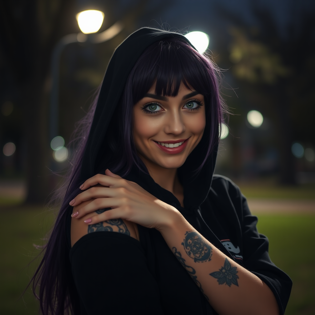 Women in a black hoodie, showing off an intricate arm tattoo, with long purple hair and playful bangs. She has striking big green eyes and a warm smile, posing in the park at night. The surroundings are softly illuminated by dim lights, creating an intimate atmosphere. It feels like a high-resolution portrait taken with a Nikon Z9 camera, emphasizing realism with a focus on her face. Despite being in a detailed setting, the primary focus remains on her confident and alluring expression, captured with advanced image rendering techniques. There's an air of allure in her smile, framed by the park's subtle ambient light. The photo avoids any distractions such as watermarks or text, drawing attention solely to her unique presence.