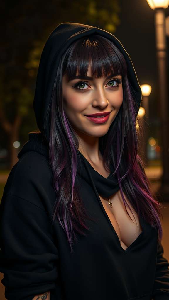 Women in a black hoodie with a visible arm tattoo, showcasing long purple hair and bangs. She has small breasts and strikingly big green eyes. The setting is a detailed, nighttime park scene with dim lights, captured in an 8k ultra-high-definition, realistic style, akin to a photo taken with a Nikon Z9. The focal point is her face, giving a seductive smile with a focused, raytraced effect. The atmosphere is intimate and engaging, with a blurred background enhancing the subject, ensuring no presence of low resolution, text, artifacts, or watermark distractions, maintaining a clean and authentic visual without unnecessary elements.
