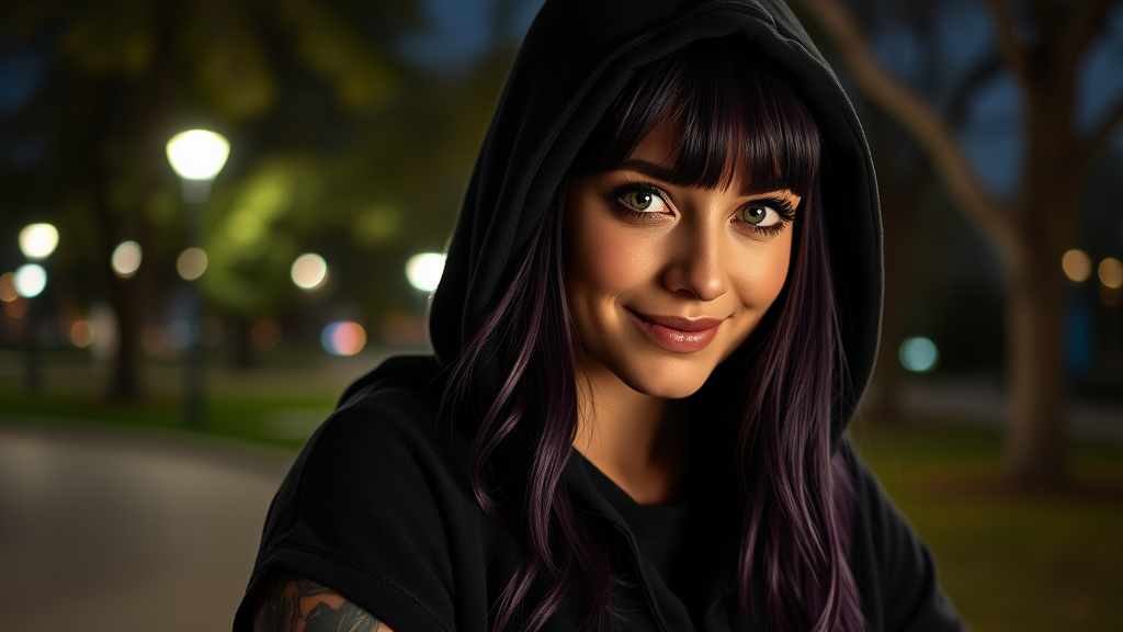 Women in a black hoodie with arm tattoos and long, purple hair styled in bangs, small breasts, and big green eyes, captured in a detailed park setting. It is nighttime with dim lights casting a warm glow. The portrait showcases her smiling with a seductive look, rendered in a realistic 8k UHD quality. The focus is on her face, shot with a Nikon Z9 using raytracing techniques, ensuring sharp detail. The composition avoids any distracting elements like signatures, watermarks, or text artifacts, maintaining clarity. The image emphasizes her features with a slight creative touch, depicting a serene environment under the night sky.