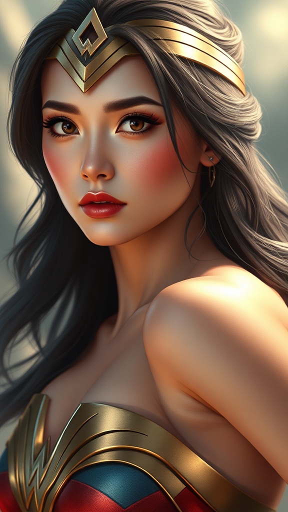 View this AI-generated image featuring wonder woman inspired attire delicate and smooth feminine bust portrait face resembling an asian actress exceptionally clear facial details elegant and realistic essence 1 with a sense of perspective highly detailed digital painting style suitable for art stati