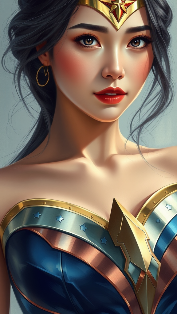 Wonder Woman Dress up, Elegant and smooth portrayal of a female, featuring delicate and polished facial details of an Asian actress, emphasizing super clear facial features. An elegant and realistic bust portrait with a focus on perspective, highly detailed digital painting, akin to art station concept art, with a smooth and sharp focus illustration. The image is executed in a manner akin to high-resolution but avoiding undesirable attributes such as blurriness, out of focus elements, poor quality, or any distortions. It should maintain proper anatomy without any additional or malformed limbs, fingers or any facial mutations, presenting an impeccably detailed aesthetic.