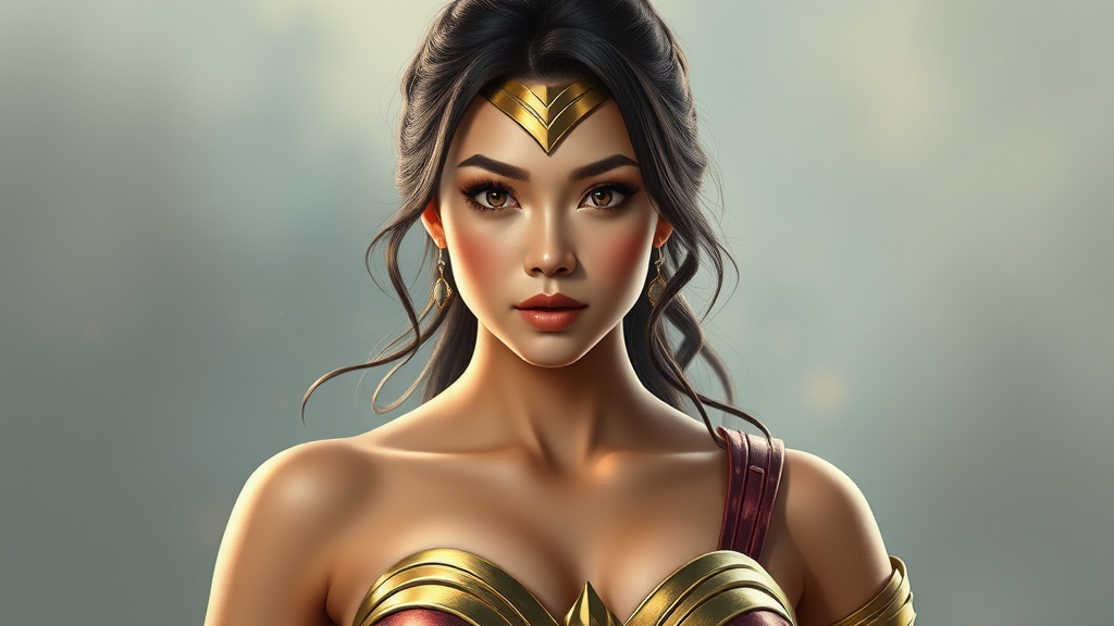 Wonder Woman-inspired attire, Graceful and smooth feminine features, Bust portrait of an Asian actress, Impeccable facial details, Stylish, Realistic: 1, Unique perspective, Intricately detailed, Digital artistry, Art station-quality, Concept artwork, Refined, Clear focus, Illustration, 8k quality, Textured, Unobtrusive frame, Avoid low quality, No jpeg artifacts, Aesthetic design, Singular face, Natural anatomy, Proportional features, Standard anatomy, Defined limbs, Complete arms and legs, Accurate fingers, Properly drawn face.