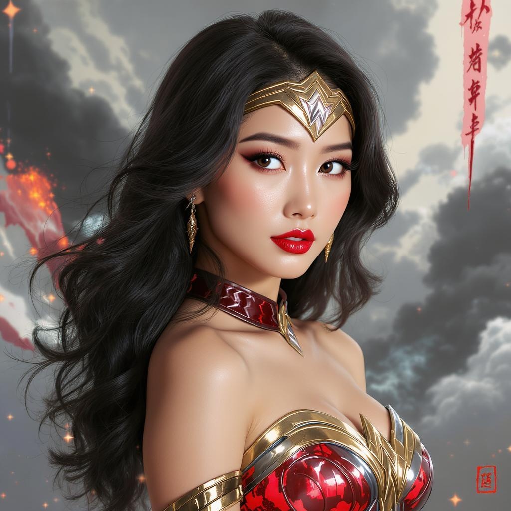 Wonder Woman-inspired ensemble, Graceful and smooth feminine figure, Portrait of an Asian actress, highly defined facial features, stylish and realistic portrayal: 1, Captivating angle, intricately detailed, digital painting, art station, concept art, Smooth, crisp focus, illustration, 8k clarity, slightly out of frame, close up, exclude unwanted elements - unsubstantial details, duplicates, distorted, additional or unusual features, improperly drawn aspects, and other deformities for an elegant presentation.