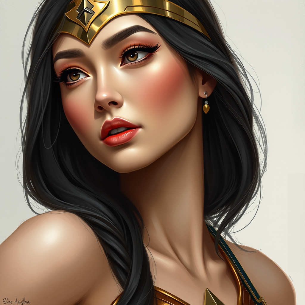 Wonder Woman-inspired outfit, Graceful and smooth female portrait, Asian actress features, exceptionally detailed facial clarity, sophisticated, lifelike: 1, Angle, intricately detailed, digital artwork, art station, concept illustration, Sleek, Sharp clarity, painting, 8k slightly out of focus, ++, words, detailed view, partially visible, poor quality, subpar quality, compression artifacts, unattractive, replica, unsettling, distorted, extra digits, misshapen hands, inaccurately drawn hands, inaccurately drawn face, mutations, distorted, unclear, emaciated, incorrect anatomy, incorrect proportions, surplus limbs, mirrored face, distorted, bizarre proportions, disfigured limbs, absent arms, absent legs, additional arms, additional legs, merged digits, excessive fingers, elongated neck.