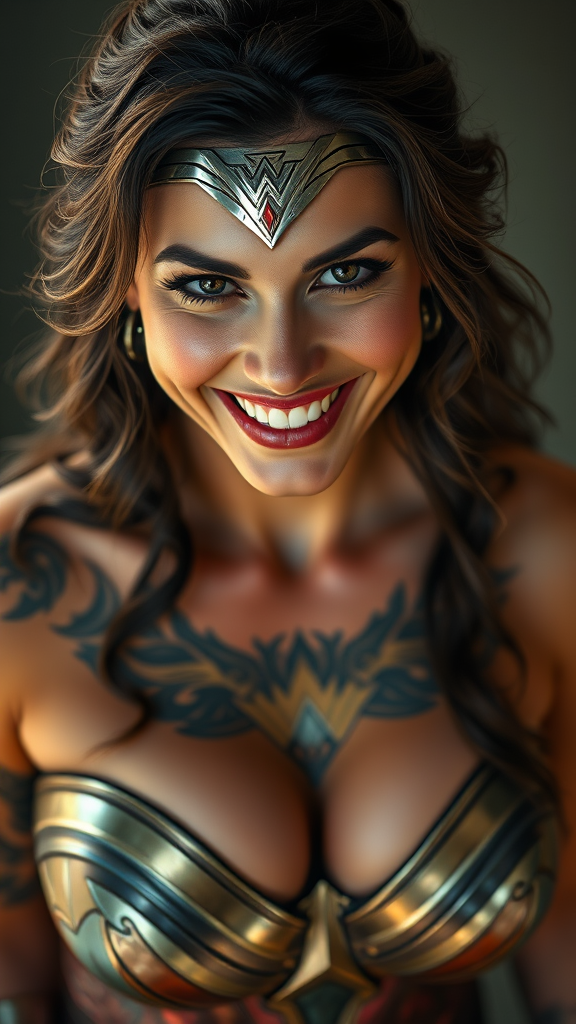Wonder Woman, joyful expression, intricate tattoo, metallic lingerie, direct gaze at the viewer, portrait style, detailed skin texture, ultra-realistic, high-definition, meticulously detailed, captured in full-length frame, vivid and high-quality color art, piercing adornment, softly diffused lighting, shallow depth of field, sharp and focused image, hyperrealistic, cinematic illumination, low resolution issues, text errors, cropped image, undesirable quality, jpeg distortions, unattractive, duplicates, unusual, distorted features, out of frame, additional fingers, distorted hands, poorly illustrated hands, poorly depicted face, abnormal alterations, fuzzy details, dry appearance, flawed anatomy, incorrect proportions, extra or missing limbs, cloned or disfigured face, distorted proportions, malformed extremities, missing or additional arms and legs, fused or excessive fingers, extended neck, presence of usernames, watermarks, or signatures.