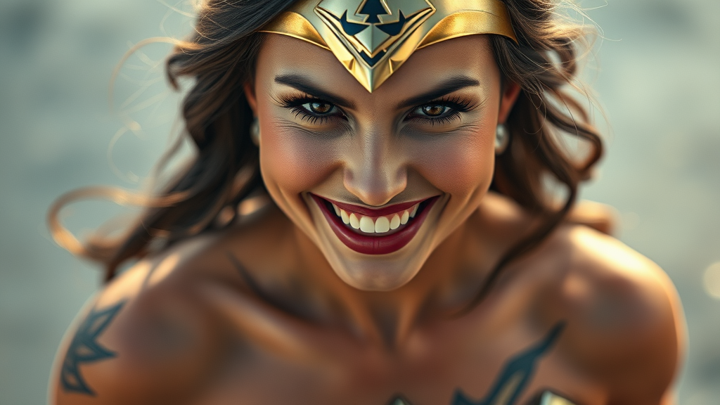 Wonder Woman, joyful expression, tattoo, metallic lingerie, direct gaze, portrait photography, detailed skin texture, hyper-realistic and photo-realistic appearance, 8k resolution, highly detailed full-body composition, vivid RAW color artwork, piercing gaze, diffuse soft lighting creating depth, shallow depth of field for focus, cinematic and hyper-realistic lighting, low-resolution textural elements, minor imperfections, subtle jpeg artifacts, unique character portrayal, natural anatomy, correct proportions, realistic rendering, complete limbs and fingers, lifelike hands and face, harmonious proportions, coherent limb arrangement, balanced facial features, accurate anatomy, seamless composition, visually appealing, life-like representation, captivating detail, authenticity, no watermarks or signatures.
