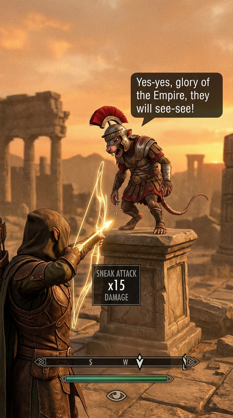 Third-person view as if playing Skyrim, full HUD visible (compass, stamina bar, sneak eye half-open). A Wood Elf archer is mid-draw, bowstring pulled back, arrow glowing slightly with absurdly high sneak damage. In the center of the screen stands a Skaven in mismatched Roman legion armor—red plume helmet crooked over twitching rat ears, lorica segmentata barely fitting his hunched body—dramatically monologuing to himself about “yes-yes, glory of the Empire.” The arrow is frozen a split-second before impact, aimed directly at the Skaven’s exposed tail, while a tiny on-screen notification reads: “Sneak Attack x15 Damage.” The Skaven hasn’t noticed the Wood Elf at all. Tone is cinematic but stupidly funny, like a serious epic ruined by perfect timing.