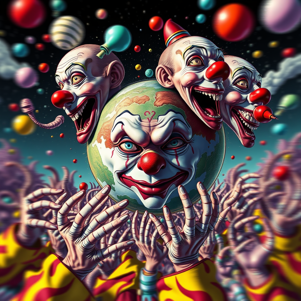 World of chaos, surreal and vibrant, high-resolution depiction of a clown-like planet with exaggerated features, mirrored elements, distorted facial expressions, elongated necks, additional digits, and bizarrely shaped hands, echoing a sense of disorder and mutation. Faces appear duplicated and altered, with crossed eyes and odd proportions. The composition includes intentional imperfections like blurriness, artifacts, and partial obstructions, giving a cartoonish and fragmented view, reminiscent of low-resolution, watermarked images. The scene is an imaginative exploration of a distorted reality, where the boundaries between what is real and what is cartoonishly unreal blur into a chaotic yet captivating visual narrative.