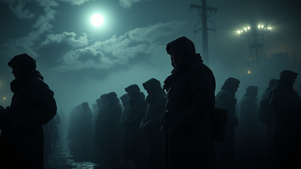 World War II refugees gathered in line, patiently awaiting their turn to board a vessel under a chiaroscuro sky. The scene captures the full bodies of these weary travelers in a hyperrealistic and highly detailed portrayal, exuding a comprehensive cinematic feel with the best quality and ultra-sharp focus. The midnight hour envelops the setting in volumetric fog, with moonlight casting eerie shadows. Despite the low resolution, hints of jpeg artifacts create an air of authenticity, while text errors and missing digits add a phantom-like quality to the figures. Limbs and features are occasionally distorted, with irregular anatomy like extra fingers or fewer digits contributing to the uneasy realism. Cropped bodies and out-of-frame elements challenge the composition, lending a dreamlike ambiguity. Tiling and fractured imagery disrupt the scene, enhanced by blurry, misshaped figures that evoke a sense of gross mutation. Disfigured forms and poorly drawn hands and feet meld into the fog, while the watermark and text etched into the picture suggest a forgotten artist's signature. Building lights in the background flicker softly, illuminating the melancholic narrative of displacement and hope.