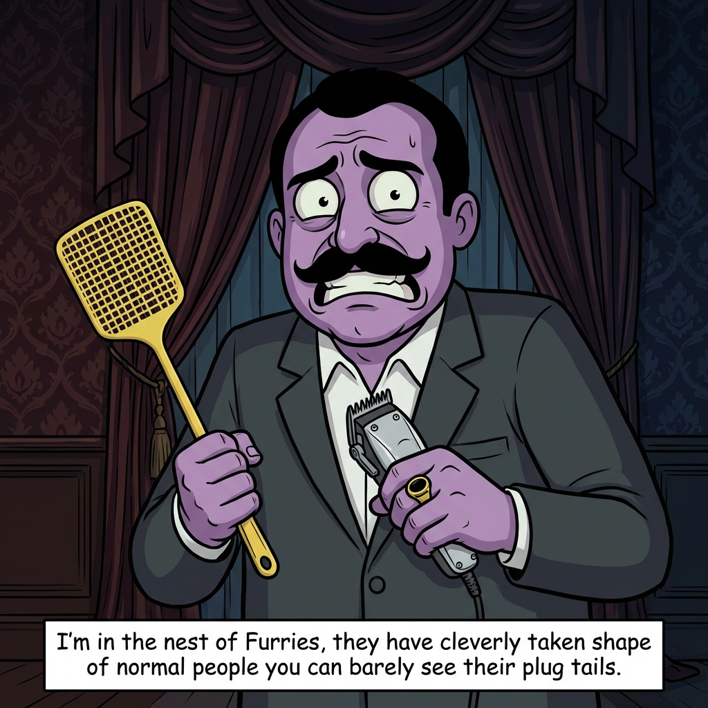 A cartoonish, purple-skinned man with a bald head, large, wide-open eyes, and a prominent black mustache, wearing a grey suit jacket. He holds a fly swatter in his left hand and a hair clipper in his right hand. A gold ring with a black stone is on his right ring finger. His expression is one of worry or fear. The background features dark, ornate wallpaper and drapes, suggesting a dimly lit, old-fashioned room. The art style is a blend of digital illustration and comic book art, with bold outlines and flat colors, enhanced by subtle shading. The mood is eerie and slightly unsettling, amplified by the dark, muted color palette dominated by purples, greys, and deep blues. Text overlay at the bottom: "I'm in the nest of Furries, they have cleverly taken shape of normal people you can barely see their plug tails."