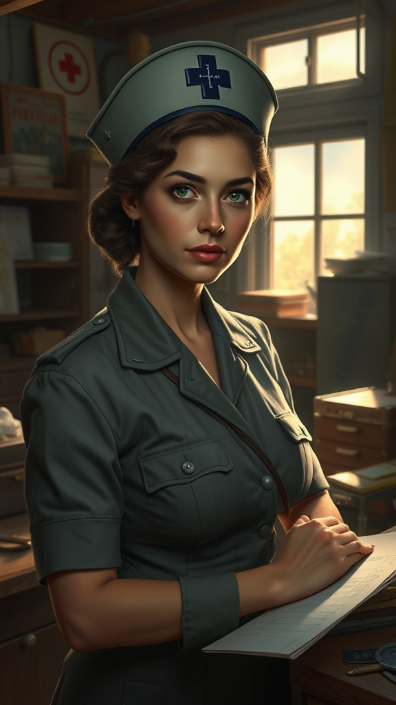 WWII nurse in a vintage military office, highly detailed and cinematic light casting shadows, concept art illustration with intricate details. A masterpiece of hyper-realistic digital painting, 8k resolution, trending on Artstation. Inspired by the styles of Magali Villeneuve, Artgerm, Greg Manchess, Tom Bagshaw, and Jeremy Mann. The nurse is depicted with a serene yet determined expression, surrounded by historical medical equipment and notes. Her uniform is precisely detailed, capturing every fold and button. The background shows period-appropriate decor and a window revealing a hint of the outside world. The scene is free of any distortions or visual obstructions, ensuring a clear view of her determined gaze and steady hands, reflecting her dedication and resilience amidst the chaos of war.